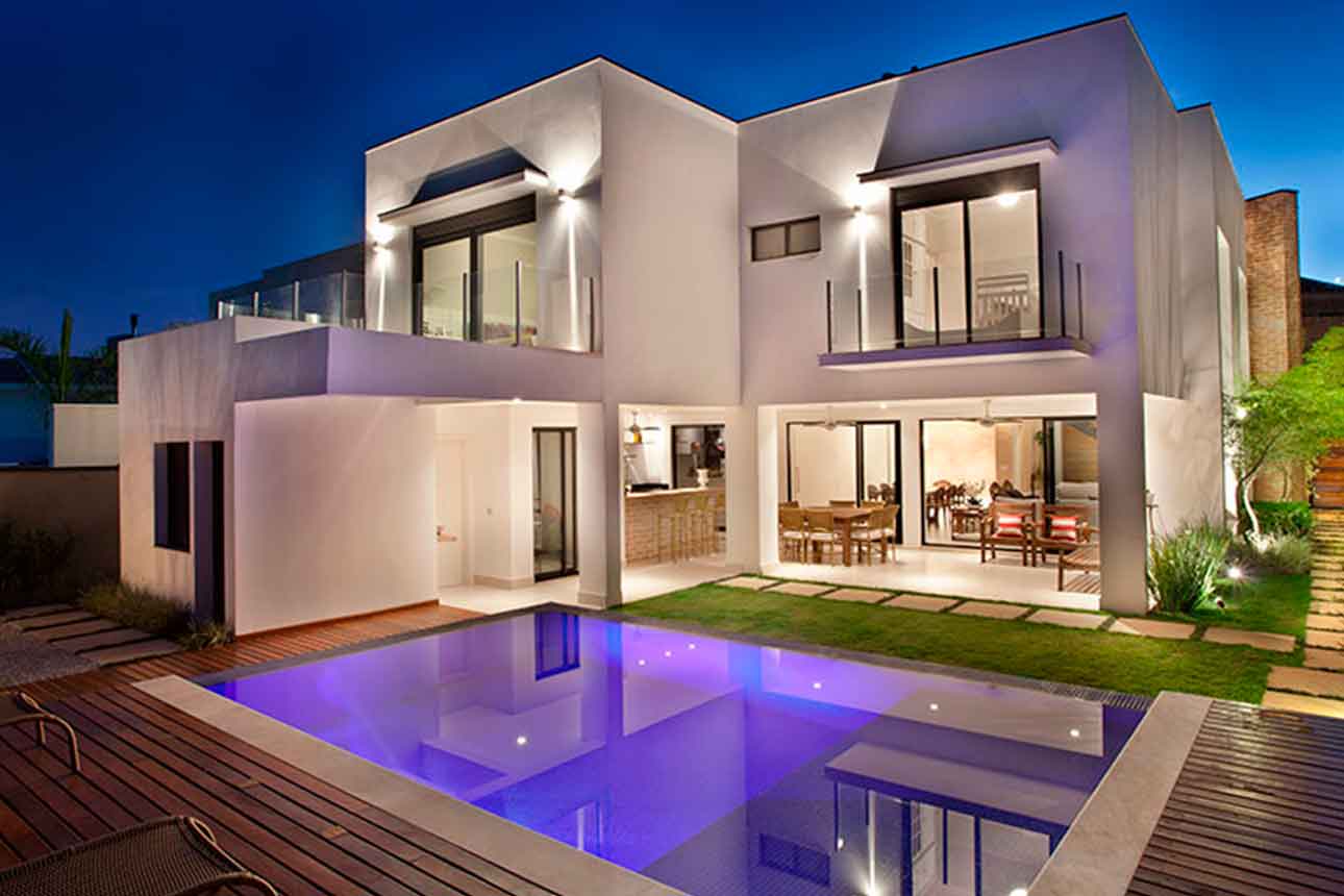Na área interna prevalesceu a integração. a cozinha, conta com duas portas de correr, uma menor, para o dia a dia e outra, bem maior, que corre e abre boa parte da mesma, integrando o balcão existente com a sala de jantar. Grandes portas de vidro, correm e abrem integrando a área interna com a churrasqueira, e a varanda. A piscina, elevada 60 cm, tem borda rebaixada criando uma queda dágua para a casa, além de protege as crianças de eventuais quedas inesperadas.